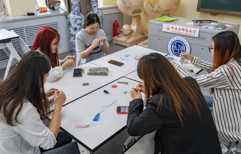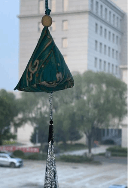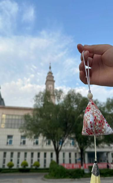 彩色花布、彩绳、流苏挂饰、艾草等材料一应俱全,大家其乐融融围坐在一起,用针线一钩、一穿、一折、一缠,再将艾草装入香囊,最后串上珠子和流苏,一个个小巧精致、造型独特的香囊就做好了,看着自己亲手制作的香囊,大家脸上露出了欣喜的笑容。每一个香囊都承载着对中华优秀传统文化的深深敬意,同时也寄托着对美好生活的热切期盼。同学们在一锤一捣的研磨中,在一针一线的缝合中感受中国传统文化的魅力,寄托端午安康的美好愿景,传承中华民族的精神文化根脉。