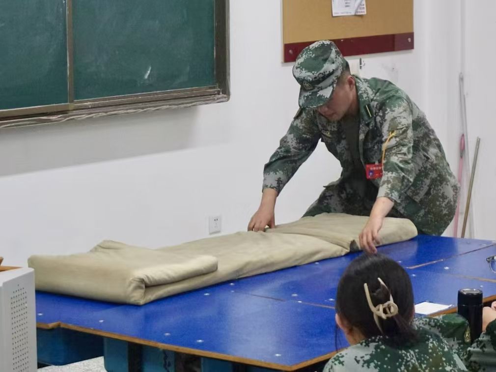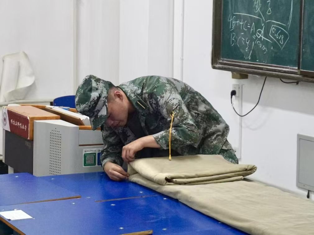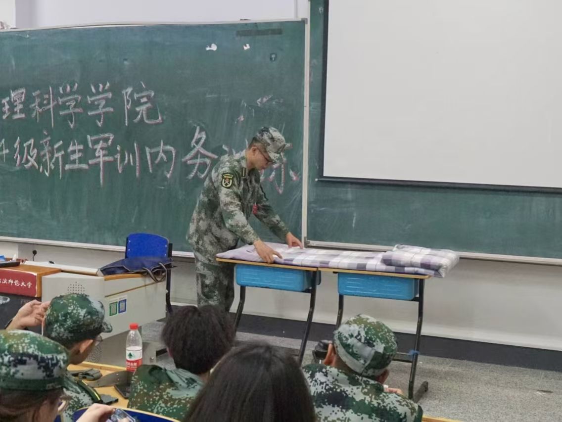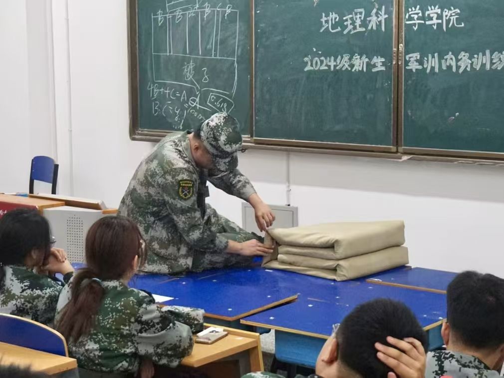 劳以养德,勤以修身。出门看队伍,进门看内务。训练场上磨练精神,内务整理彰显态度。内务整理是军训的必修课,能培养学生吃苦耐劳的精神,引导学生养成良好的生活习惯。为提高学生内务整理能力和独立生活能力,培养纪律意识和团队合作精神,地理科学学院于军训宣传周在崇师楼教室组织开展2024级学生内务教学活动,2024级全体同学参加,由军训教官对同学们进行培训,讲解内务整理的方法。