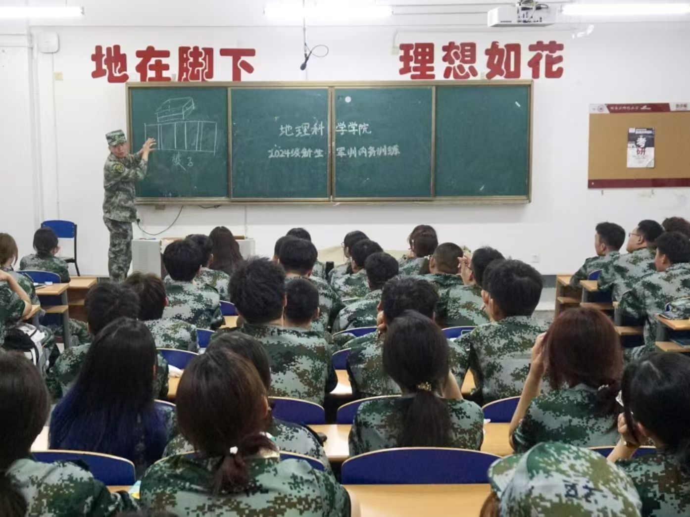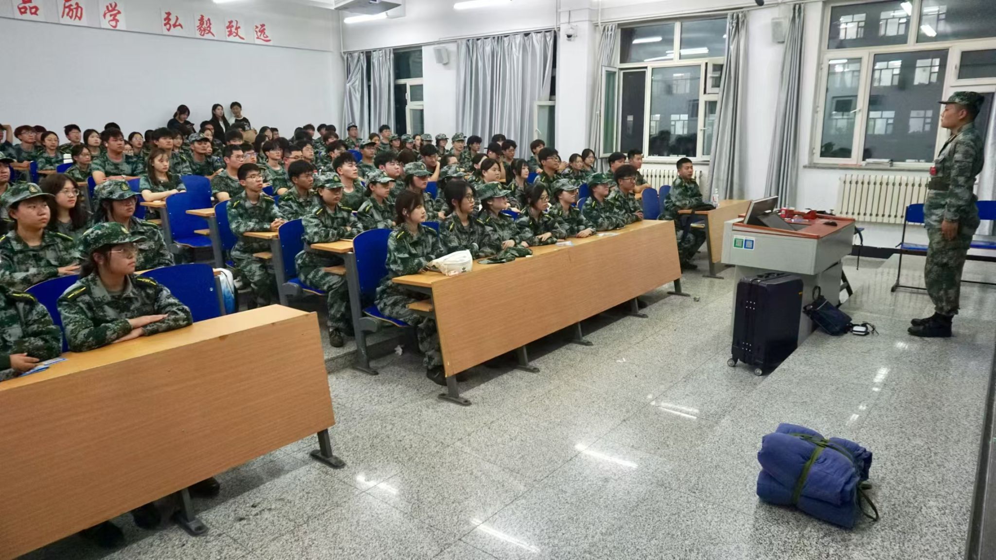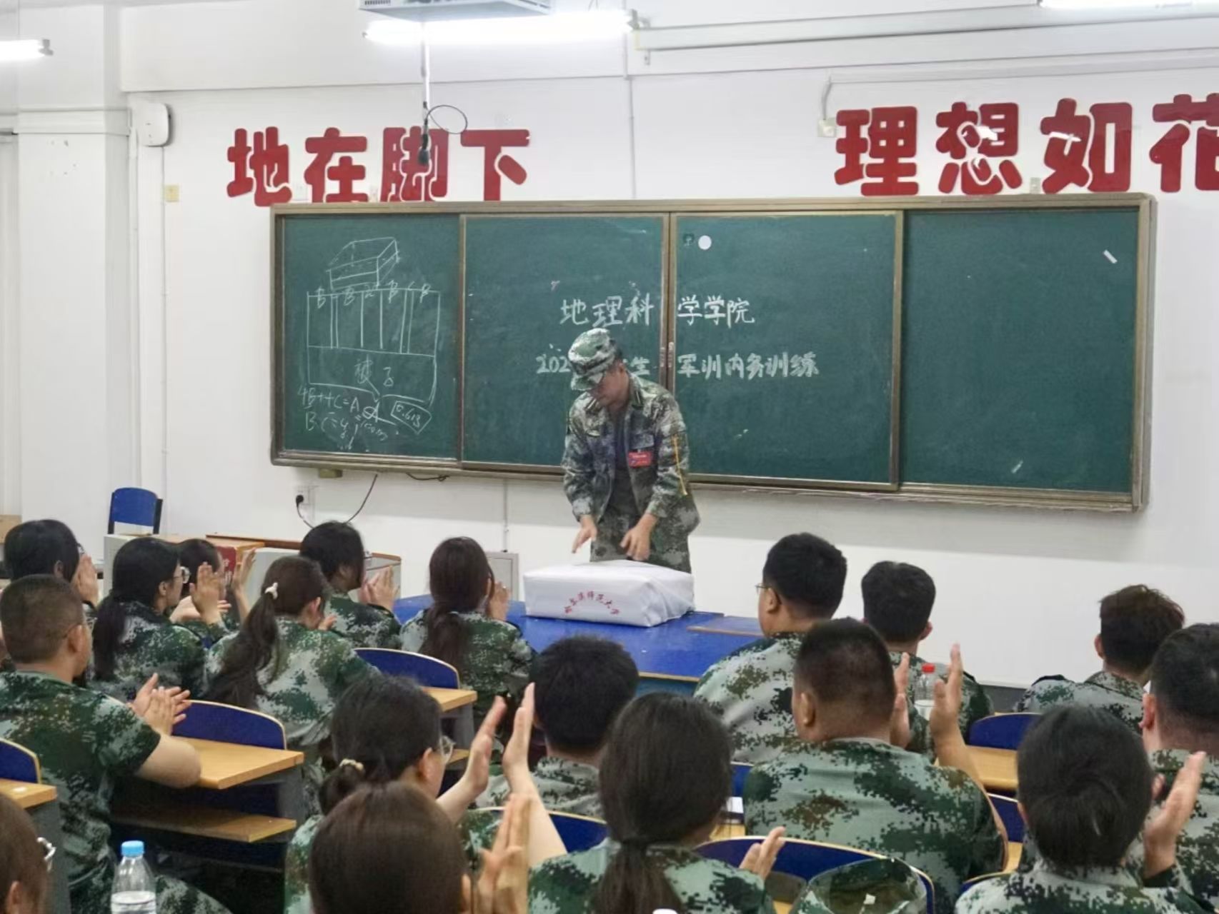 劳以养德,勤以修身。出门看队伍,进门看内务。训练场上磨练精神,内务整理彰显态度。内务整理是军训的必修课,能培养学生吃苦耐劳的精神,引导学生养成良好的生活习惯。为提高学生内务整理能力和独立生活能力,培养纪律意识和团队合作精神,地理科学学院于军训宣传周在崇师楼教室组织开展2024级学生内务教学活动,2024级全体同学参加,由军训教官对同学们进行培训,讲解内务整理的方法。