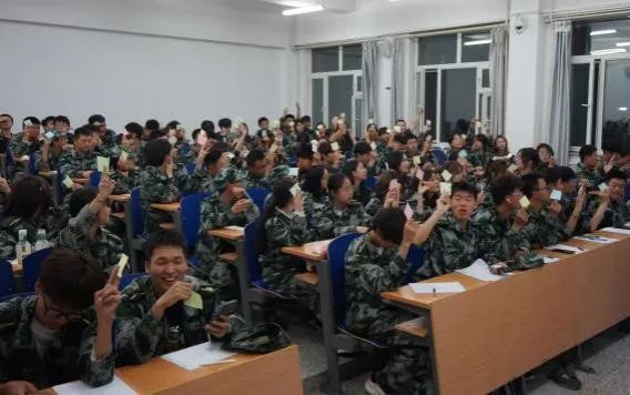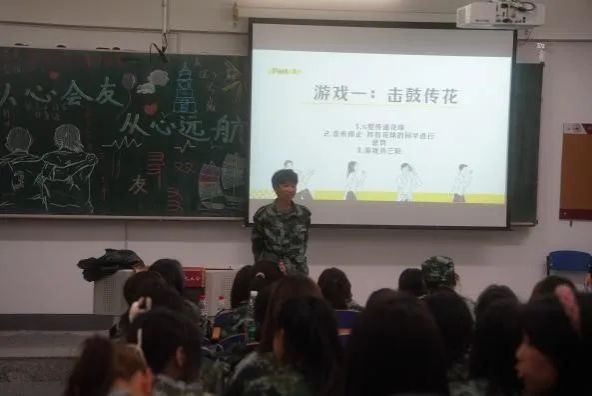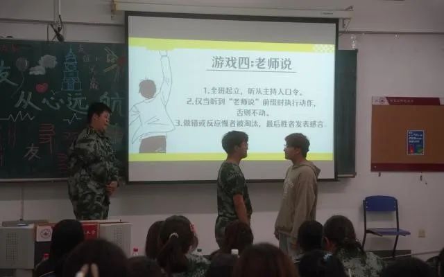全体同学起立,统一听从主持人口令进行相应动作。每个人神经紧绷,快速反应,在紧张与兴奋的情感中学会了倾听与配合,在愉快放松的氛围中增加了默契。