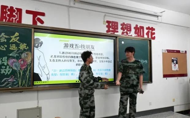 通过网络链接MBTI进行人格测试,同学们在人群中穿梭,寻找与自己“匹配”的朋友。每一次成功的“配对”都伴随着欢快的笑声和友好的拥抱,大家找到了志同道合的伙伴,共同探讨未来的梦想与规划,新的友谊之花在校园中绽放。