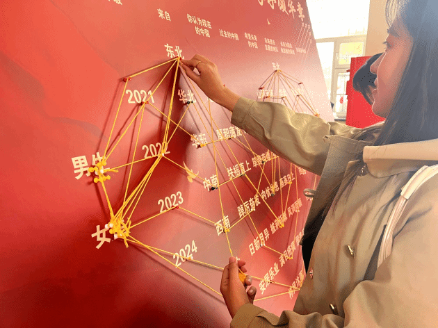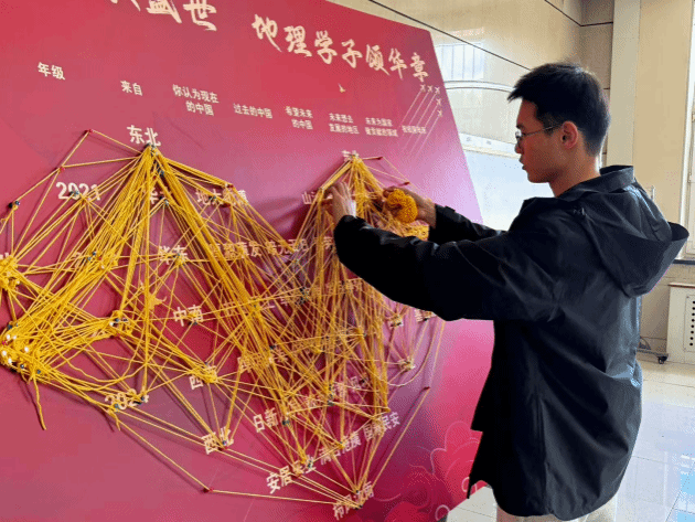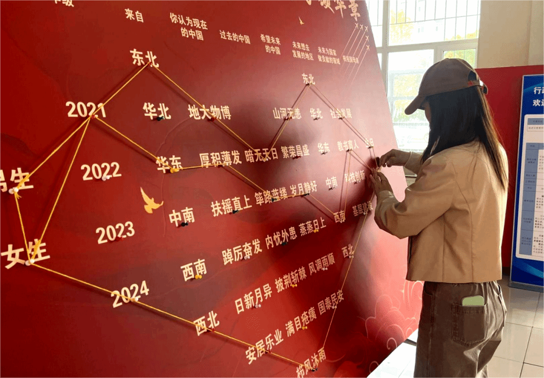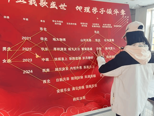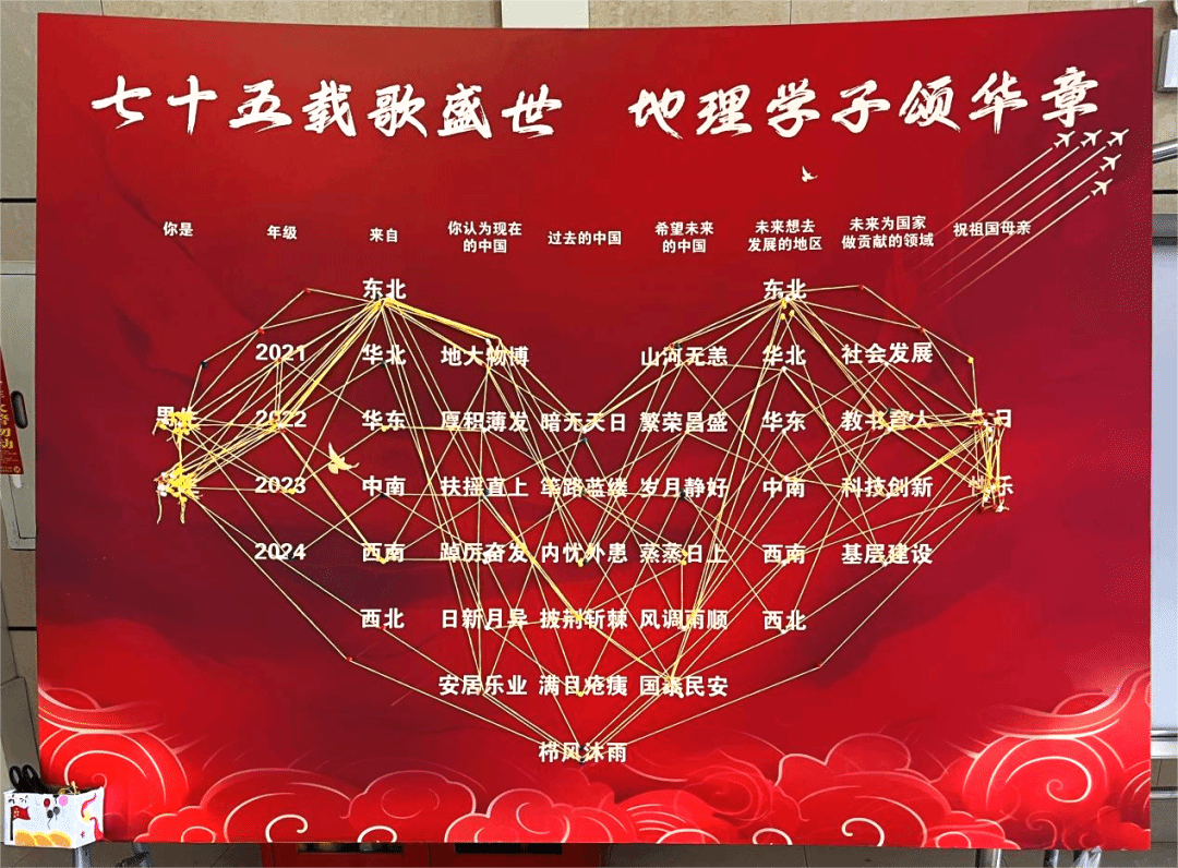忆往昔峥嵘岁月稠,看今朝旖旎风光秀。本次活动引得来往上课的同学纷纷驻足观看,积极参与其中。从对祖国艰辛成长的感慨、到对祖国奋勇向前的赞叹,再到对祖国未来发展的期待......祝福板上满是地理学子对祖国最真切的告白,一根根线将青春的热血与对祖国的祝福连接起来,勾勒出独属于“我和我的祖国”的心心相爱。未来的他们,或是投身边疆基层建设,或是坚守岗位教书育人,亦或是科技研发探索未知,都将以各自的方式展现对祖国的自豪与热爱。