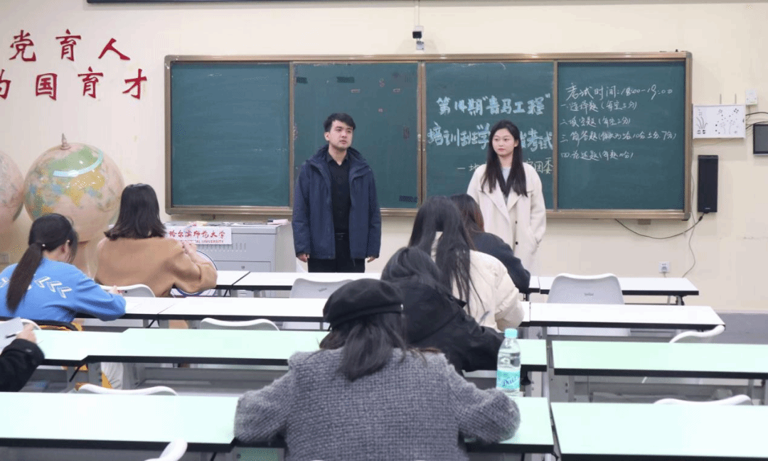 为深入学习贯彻习近平新时代中国特色社会主义思想和党的二十届三中全会精神,以实际行动回应习近平总书记“奋力书写为中国式现代化挺膺担当的青春篇章”的寄语,加强对开元(中国)青年的思想政治引领,引导广大团员青年坚定不移听党话跟党走,为学校第十四期“青马工程”培训班输送优质力量,10月23日18:00,地理科学学院在理工三215室举办哈尔滨师范大学第十四期“青马工程”培训班推荐学员选拔考试。团委指导教师金宇茜、2022级辅导员李昀东担任此次选拔考试的监考教师。
