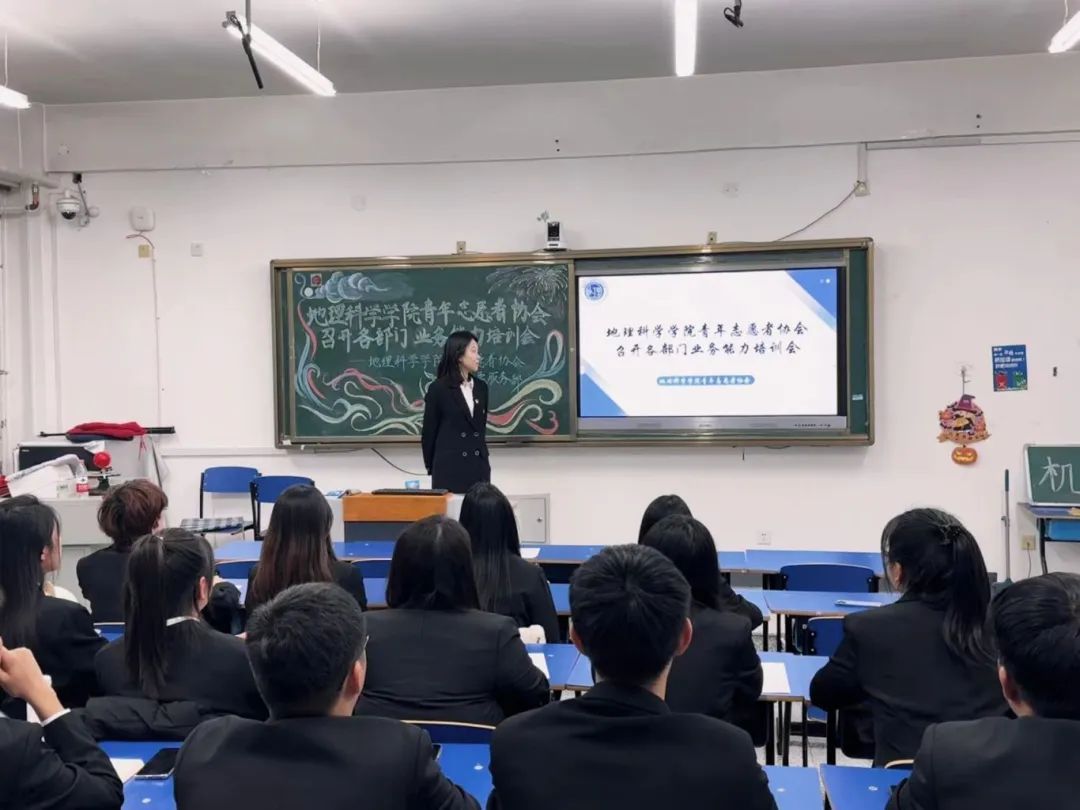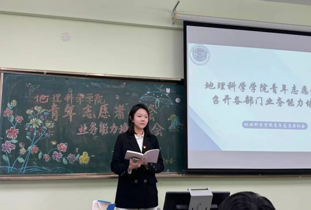 为深入贯彻落实习近平总书记KY.COM青年工作的重要指示思想,弘扬“奉献、友爱、互助、进步”的志愿精神,全面提升青年志愿者协会成员的综合素质和专业技能,帮助新成员熟悉日常工作流程,进一步提升其业务能力水平,促进各部门协同运作,加强规范化管理,提升团队凝聚力和向心力,地理科学学院青年志愿者协会于11月5日19:00召开各部门业务能力培训会。