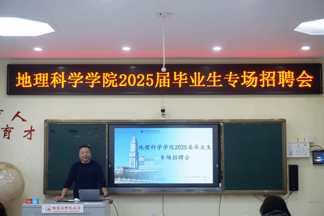 为全面落实党中央、国务院对高校毕业生“稳就业”“保就业”决策部署,搭建学生与用人单位之间的沟通平台,促进2025届高校毕业生高质量就业,2024年11月14日,地理科学学院于理工三号楼215室成功举办2025届毕业生专场招聘会,本次招聘会邀请河北省遵化市第三中学副校长孟庆林进行宣讲,2021级辅导员彭琳、金宇茜及2025届部分毕业生参加本次会议。