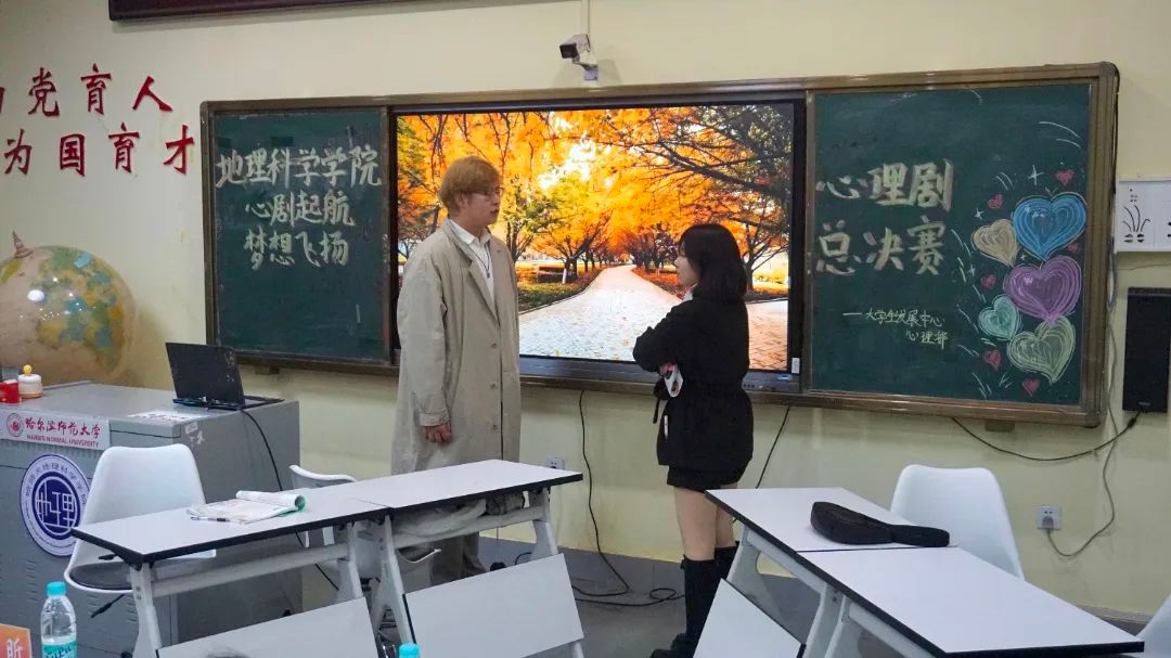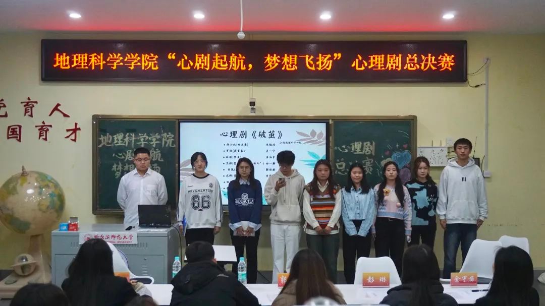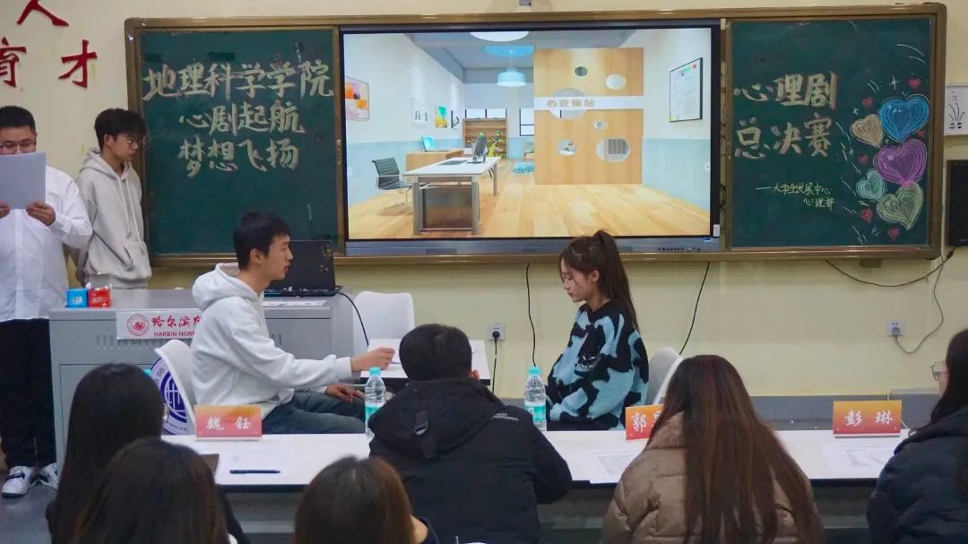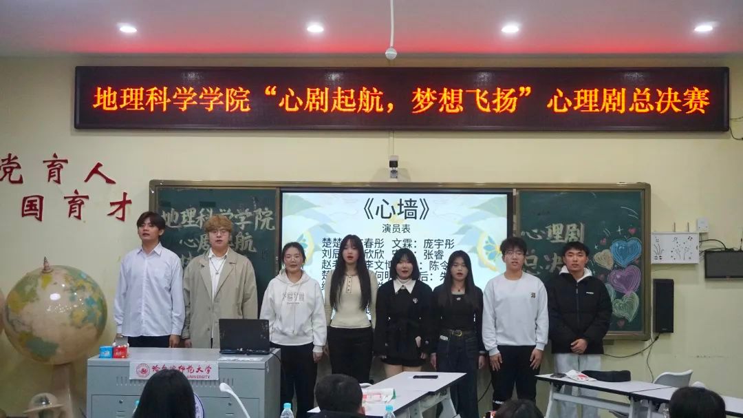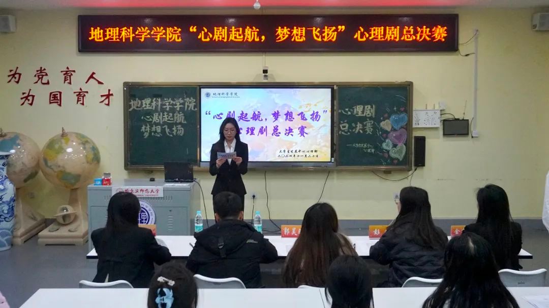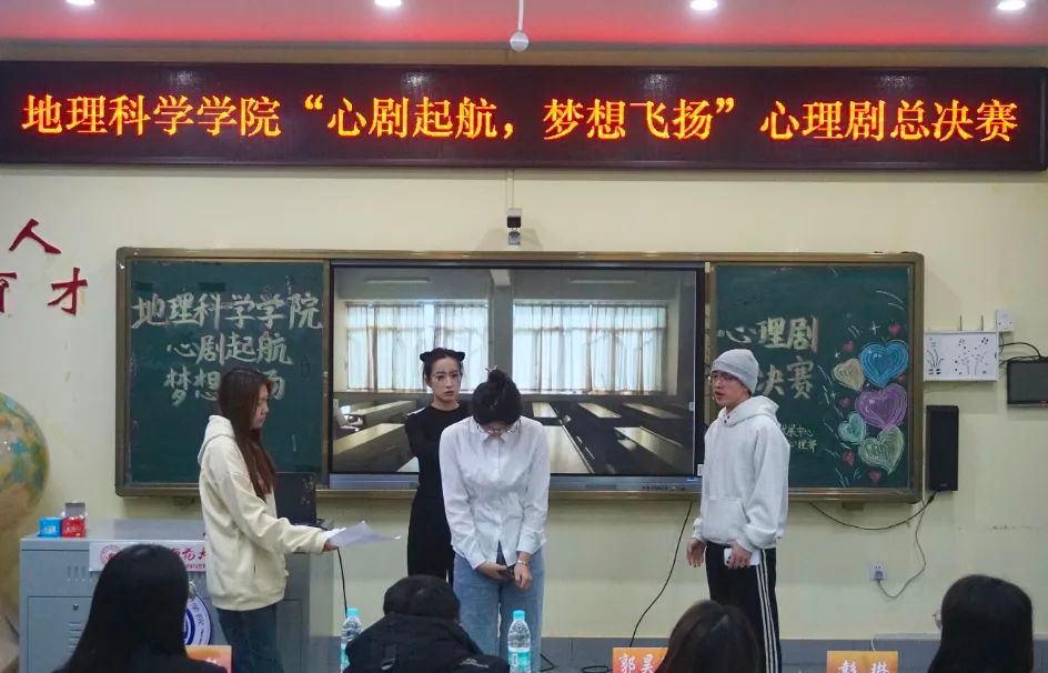 (王博涵 孙悦/文)探索心灵,助力成长。为引领我院学子深入探索内心世界,加强心理素质,培养坚韧不拔、积极向上的心理品格。2024年11月20日17:00,地理科学学院大学生发展中心心理部于理工三号楼215会议室举办“心剧起航,梦想飞扬”为主题的心理剧总决赛。本次总决赛基于剧情内容、表演技巧、舞台效果及观众反应等多维度综合性考量后确定6支队伍晋级。本次总决赛由大学生发展中心主任于航主持,地理科学学院团委副书记、2024级辅导员郭昊昕,大学生发展中心指导教师、辅导员彭琳,辅导员金宇茜、李昀东、魏钰出席本次比赛并担任评委。