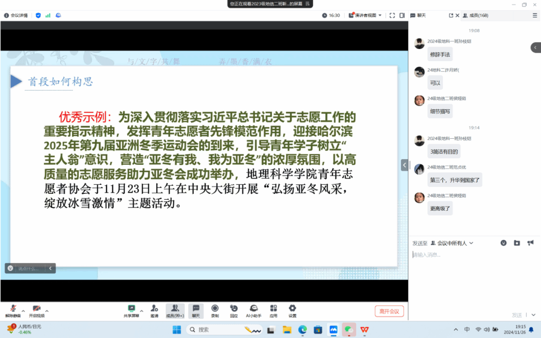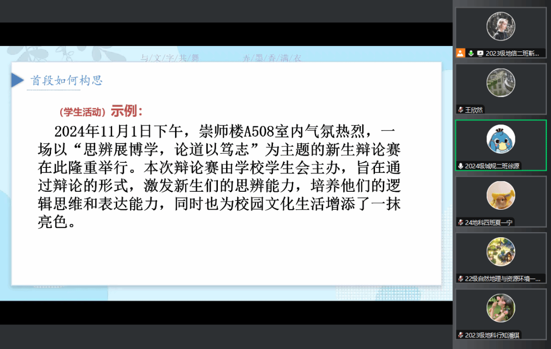 为进一步提升高等教育服务高质量发展能力,全面提高学生的写作水平和综合素质,切实增强以学促干质效,加强学生干部队伍建设,为学院的文化营造和宣传工作添砖加瓦,2024年11月26日,地理科学学院新媒体中心于线上开展文笔训练营第八期讲座,新媒体中心主任何青璇主持讲座,通讯部副部长靳鹏聪担任本期主讲人,各组织学生干部报名参加讲座。本期文笔训练营讲座面向地理科学学院全体学生开展。