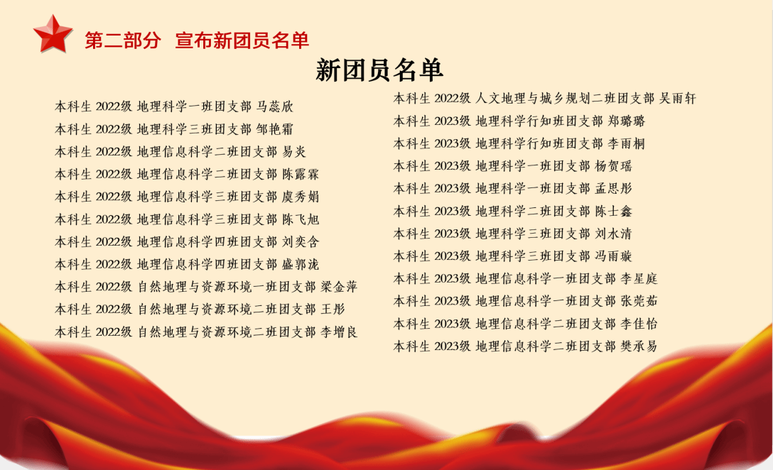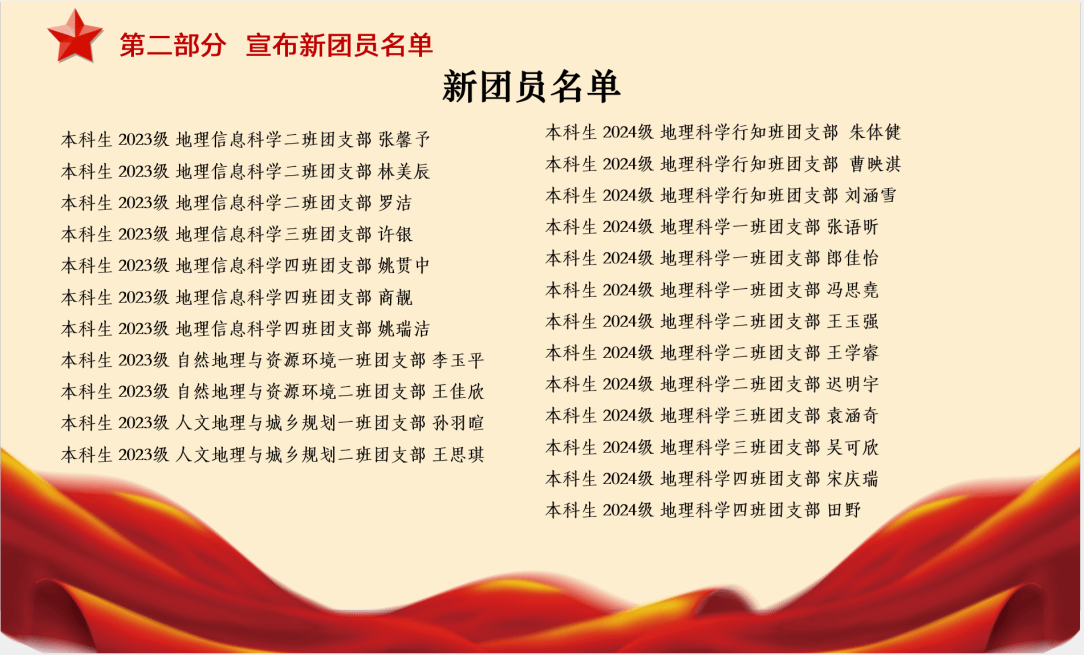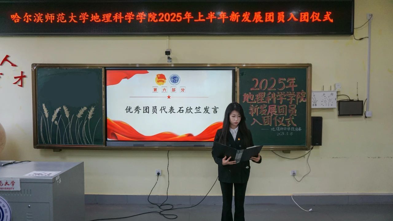 榜样寄语,砥砺前行。2023 级地理科学专业二班石欣竺同学向新团员致以祝贺,她寄语大家珍惜团员身份,在理论学习中厚植思想根基,在实践磨砺中增长才干,将个人成长融入党和国家发展大局,以“功成不必在我,功成必定有我”的担当,书写无愧于时代的青春篇章。