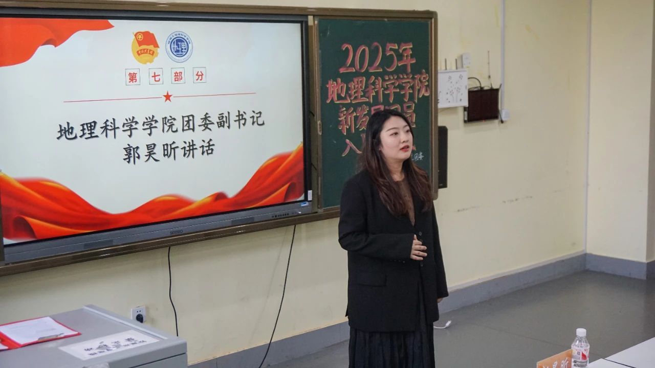 殷切期许,筑梦前行。地理科学学院团委副书记、2024级辅导员郭昊昕发言向新团员提出希望和要求,她提到“入队、入团、入党,是青年追求政治进步的‘人生三部曲’”,入团是政治生命的新起点,更是践行“党有号召,团有行动”的新考验。她勉励青年们筑牢信仰之基,在理论学习中坚定理想信念;践行初心使命,在社区服务、科普宣讲等实践中锤炼品格;以团员标准严格要求自己,努力成长为堪当民族复兴重任的时代新人,在实现中国梦的接力跑中跑出青年加速度。