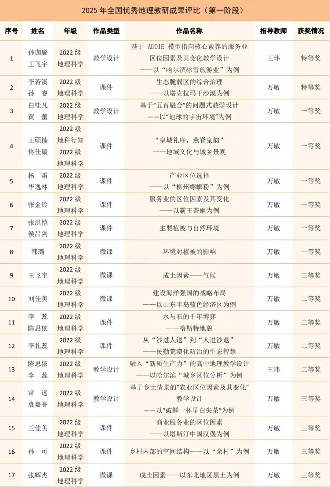 自2025年1月比赛报名至4月30日作品投稿截止,我院2022级地理科学专业同学在万敏、王玮老师的精心指导下积极备赛,不断打磨和优化作品,提高作品质量,最终同学们提交的17件作品在激烈的竞争中取得了优异成绩,为学校和学院赢得了荣誉。