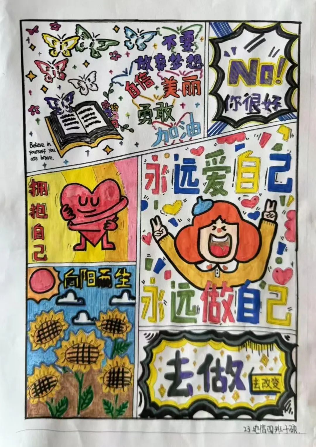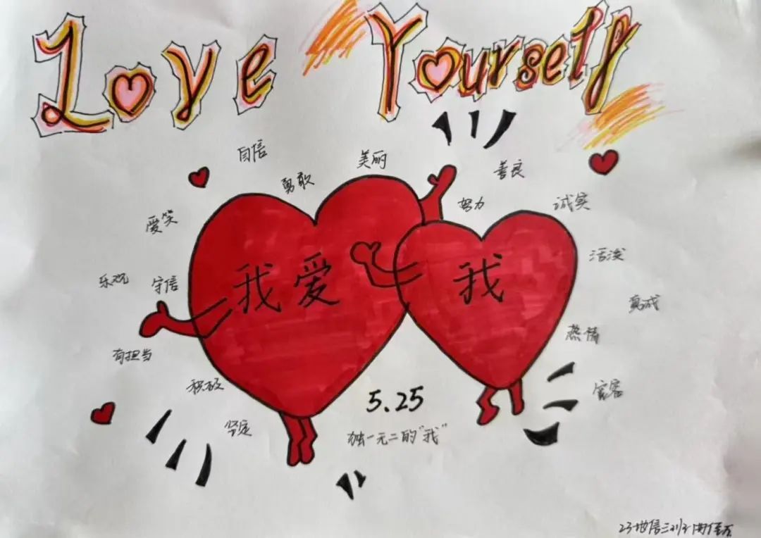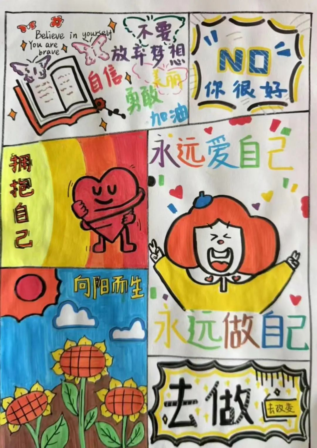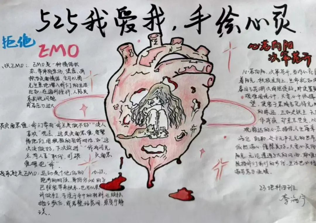 围绕“525我爱我”主题征集的优秀作品,经过学院精心遴选后,在文化墙上集中展出。23级的学子们以笔为友、以纸为伴,将心理健康知识巧妙地融入笔墨之间,把情绪调节技巧生动地展现在色彩之中,将心灵感悟深刻地沉淀于方寸画卷之上。有的作品以漫画笔触解构压力那如褶皱般复杂的肌理,有的则运用水彩晕染出积极心态那如光谱般绚丽的渐变。工整的字迹如同心路历程的深刻刻痕,明丽的色彩恰似希望在欢快跃动。每一幅作品都凝聚着创作者的心血与情感,展现出他们对心理健康的独特理解与感悟。