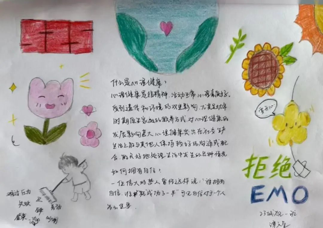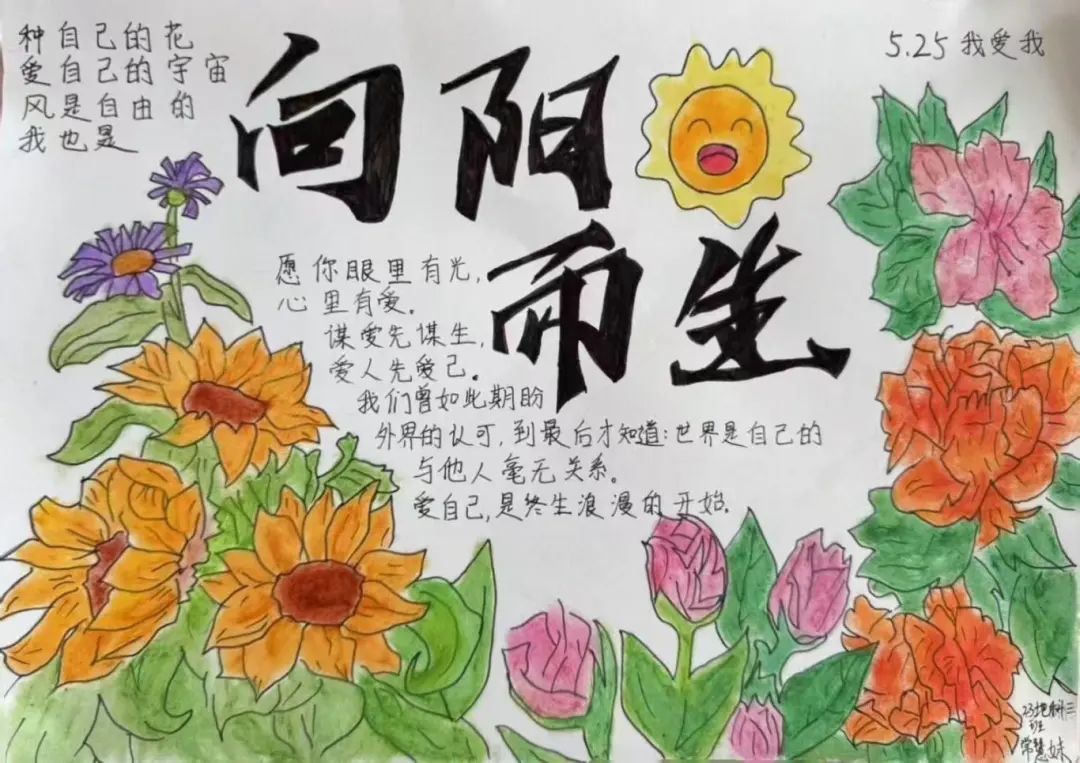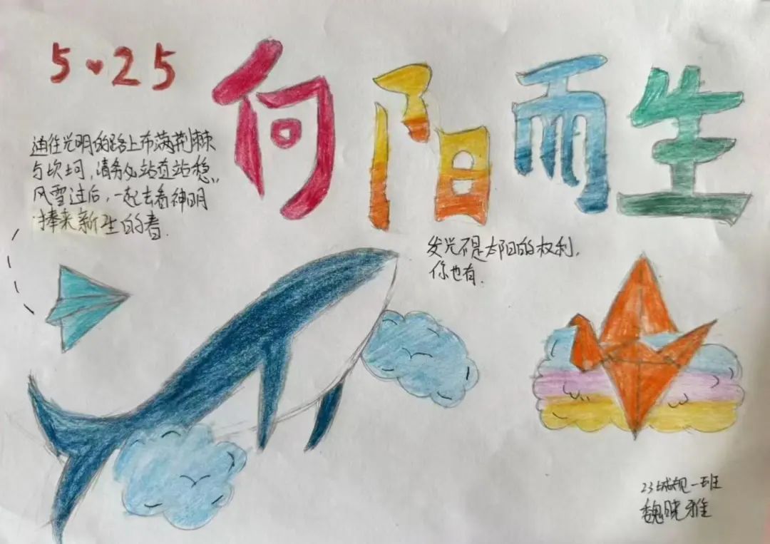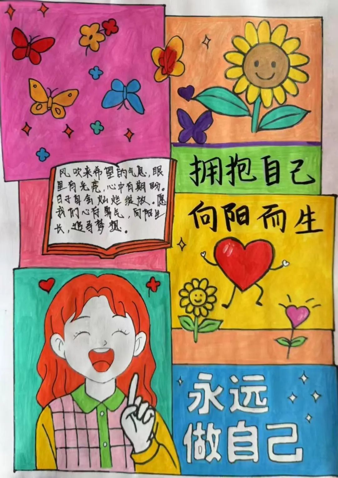 围绕“525我爱我”主题征集的优秀作品,经过学院精心遴选后,在文化墙上集中展出。23级的学子们以笔为友、以纸为伴,将心理健康知识巧妙地融入笔墨之间,把情绪调节技巧生动地展现在色彩之中,将心灵感悟深刻地沉淀于方寸画卷之上。有的作品以漫画笔触解构压力那如褶皱般复杂的肌理,有的则运用水彩晕染出积极心态那如光谱般绚丽的渐变。工整的字迹如同心路历程的深刻刻痕,明丽的色彩恰似希望在欢快跃动。每一幅作品都凝聚着创作者的心血与情感,展现出他们对心理健康的独特理解与感悟。