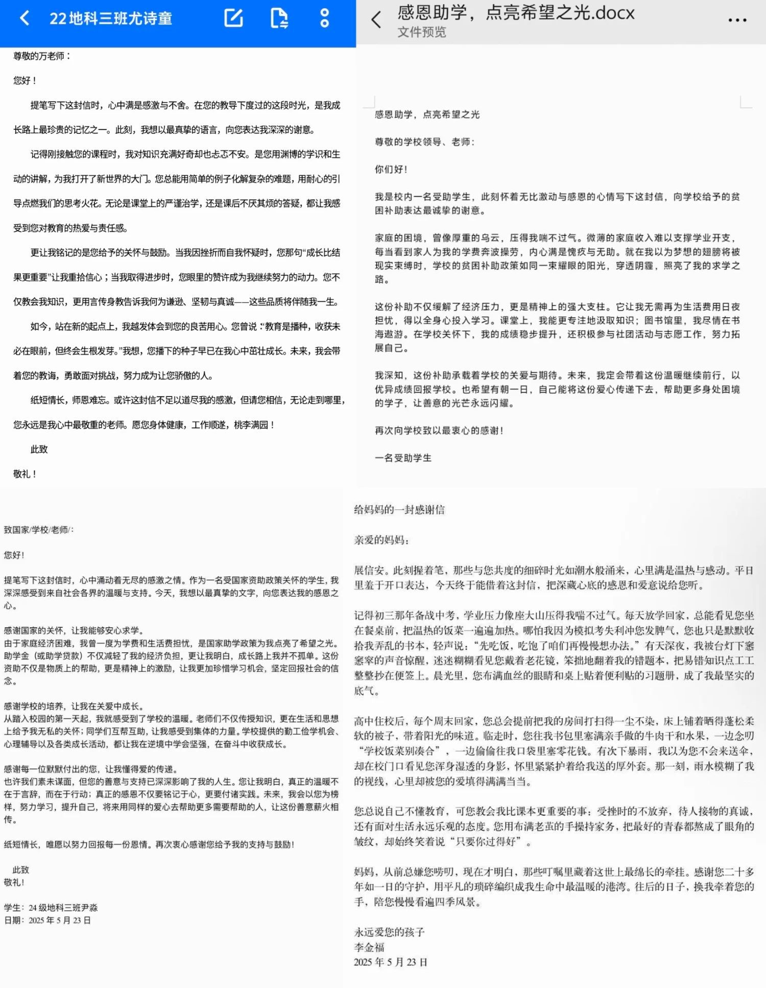 那些藏在文字里的温暖与感动,终将化作前行的力量。接下来,就让我们透过一组组感恩书信的珍贵影像,去聆听笔尖流淌的心声,感受字里行间跃动的感恩与深情。