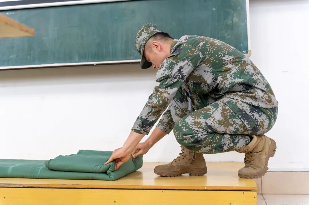 参训新生全程认真观察、细致记录,深入领会“三分叠、七分修”的内在要义,在教官的耐心指导下反复练习、调整改进,逐步掌握内务整理的标准与技巧。