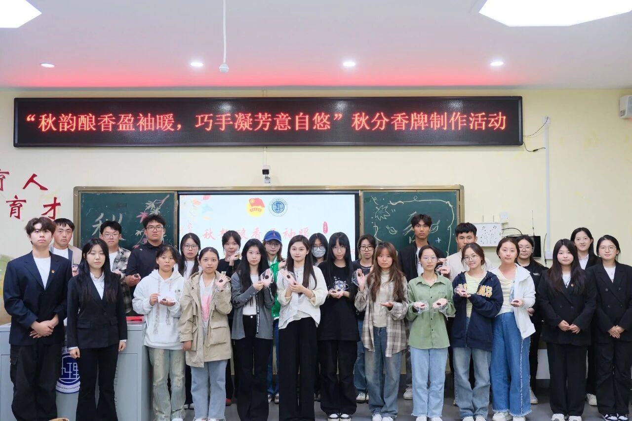 为深入贯彻党的二十大及二十届二中、三中全会精神,全面落实习近平总书记KY.COM弘扬中华优秀传统文化的重要指示精神,进一步丰富我院青年学子的精神文化生活,9月23日秋分当天,学院团委宣传部于理工三215室开展“秋韵酿香盈袖暖,巧手凝芳意自悠”秋分主题香牌制作活动。学院团委指导教师、2025级辅导员金宇茜与各年级学生代表共同参与活动,以巧手制香牌、以雅韵品秋意,在沉浸式体验中感知传统节气的独特内涵与文化魅力。