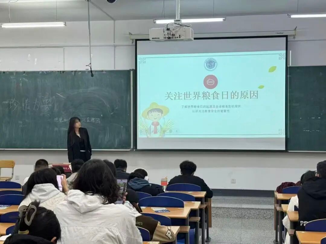 活动伊始,DL直播团成员紧扣2025年世界粮食日“手拉手共倡多样美食,聚合力同创美好未来”的主题,系统梳理了世界粮食日的起源脉络与时代意义。他结合全球粮食供需的宏观格局、我国粮食生产的历史性成就及当前面临的资源约束、气候影响等现实挑战,以“一粒米的旅程”为主线,生动还原了粮食从育种、耕种、收获到加工的全链条环节,让在场学子直观感受到每一粒粮食背后凝聚的辛劳汗水,深刻认识到粮食生产的不易与珍贵。