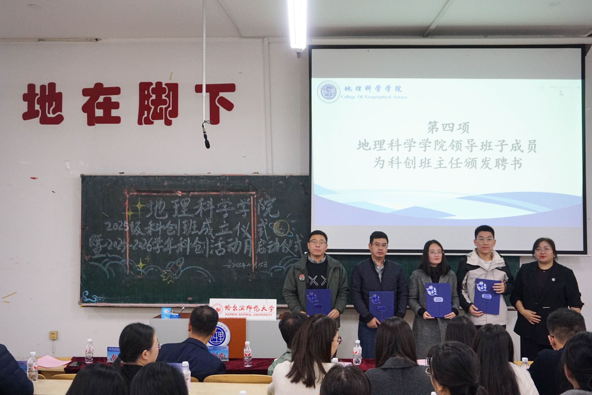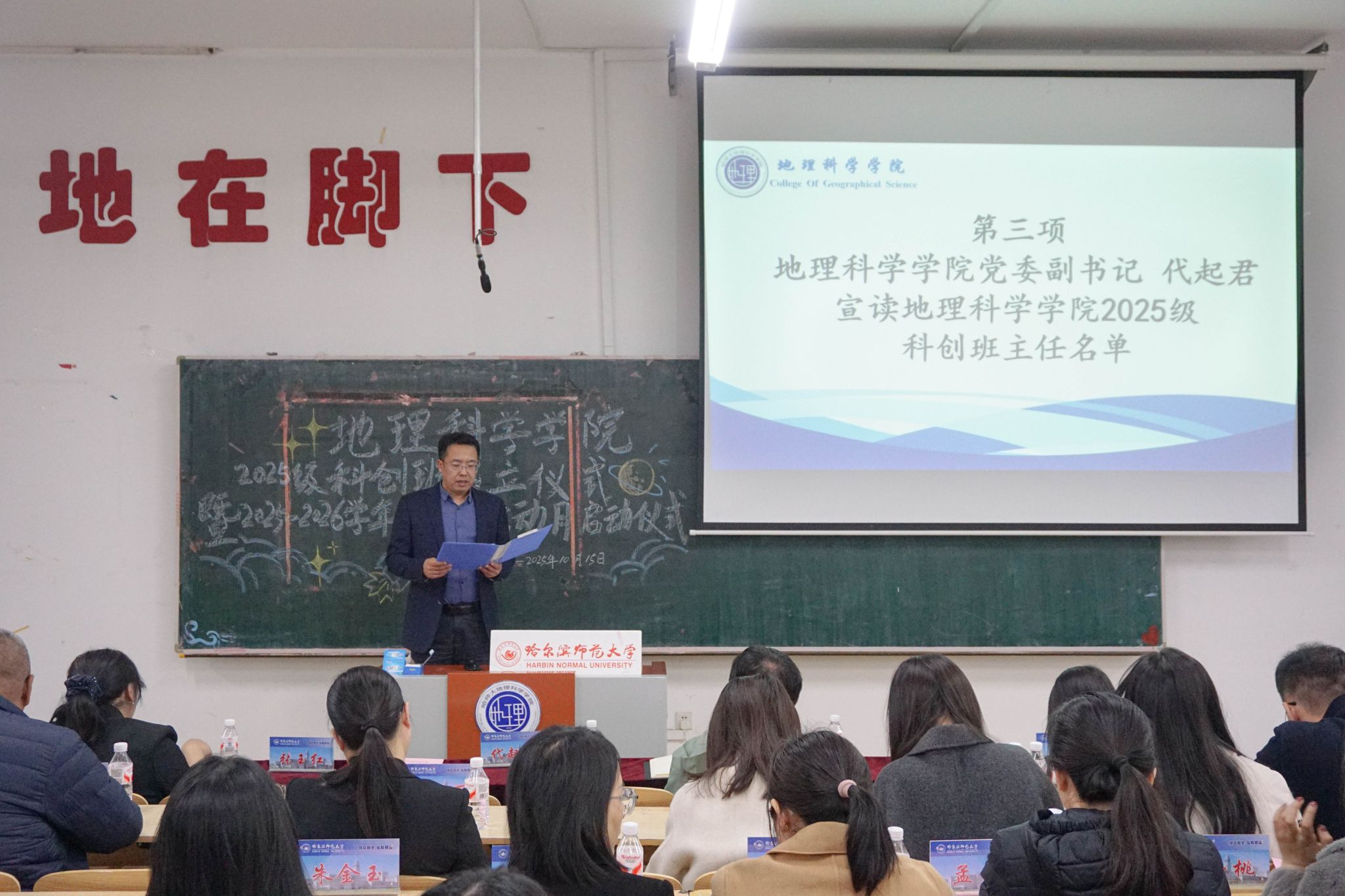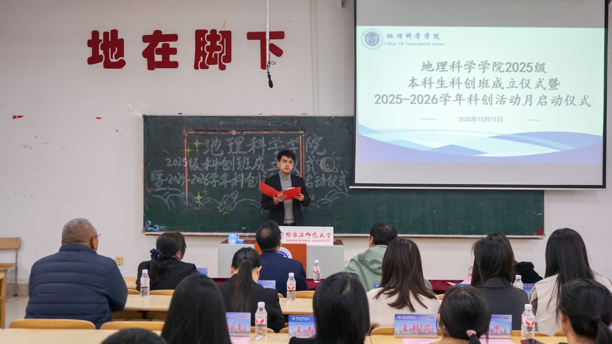 为加速推进地理科学学院创新创业教育工作建设,助力教师创新创业工作提质增效,2025年10月15日13:30,地理科学学院2025级科创班成立仪式暨2025—2026学年科创活动月启动仪式于理工三220室举行。学院院长张冬有、党委副书记代起君、副院长周嘉、副院长张玉红、各系教师代表、全体科创班主任、全体辅导员出席仪式,2024级、2025级学生代表线下参加仪式,其他全体2025级学生于线上参会。本次仪式由学院科技创新创业协会指导教师、学工办副主任李昀东主持。