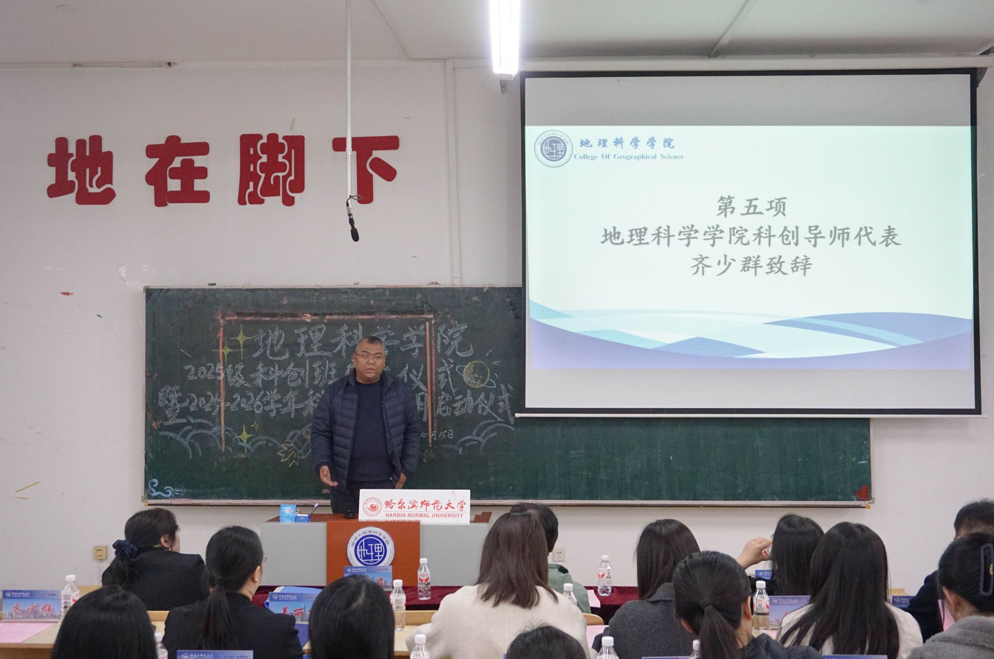 仪式第五项,科创导师代表、地理信息科学系负责人齐少群致辞,结合自身科研与育人经验,为2025级新生送上三点忠告:一是永葆科研热情,以持久热忱面对科研中的未知与挑战;二是广结科创伙伴,在思想碰撞中拓宽思路,在团队协作中攻克难题;三是坚守科创初心,不急于求成、不畏惧失败,在沉淀中成长为更具竞争力的创新人才。