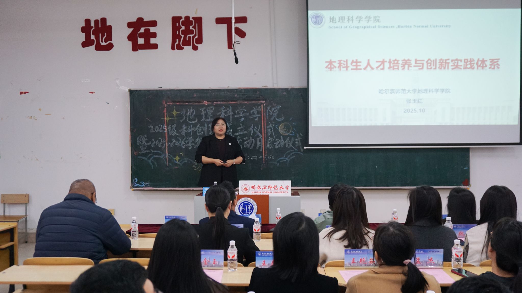 仪式第二项,副院长张玉红介绍了学院学科建设史,深度解析学院“课战赛”创新实践体系,以持续递进式培养为核心,在教师端构建“培训-引导-指导”的阶梯式赋能路径,学生端实现“专业技能夯实-综合应用提升-复杂问题解决”能力进阶。同时针对地理师范生,重点强调实习实践对专业认知、教学技能与野外考察能力的塑造作用,清晰呈现从课堂到田野、从理论到教学的全链条培养逻辑。