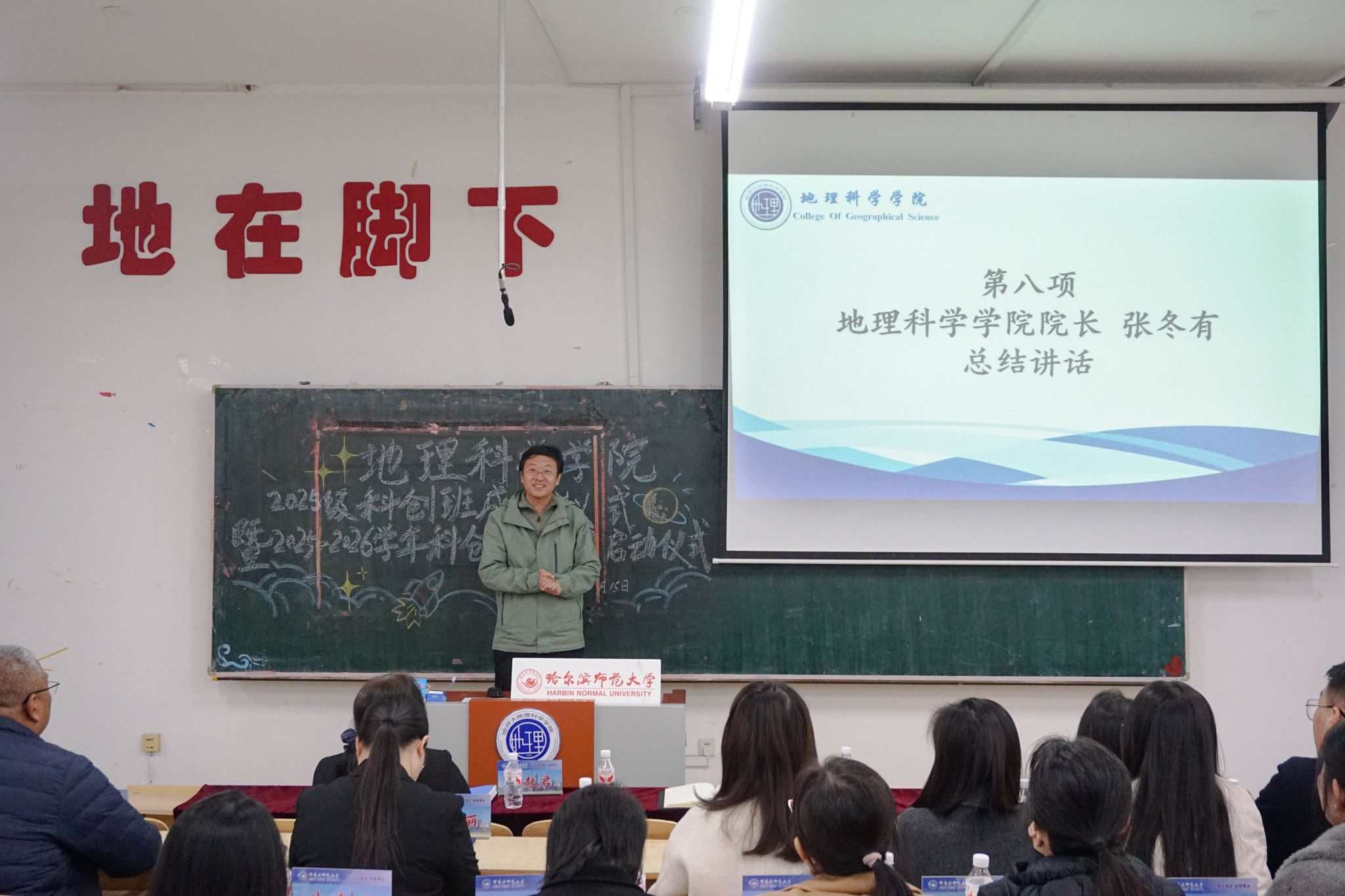 仪式第八项,院长张冬有作总结讲话,对2025级科创班的成立表示热烈祝贺,同时对学院创新创业工作提出了充满前瞻性的新期许。他强调科研创新是驱动学科发展、助力学生成长的核心引擎,在新时代背景下,地理科学领域的创新需求日益迫切,激励新生传承学院科创优良传统,鼓励同学们主动对接导师团队,在“学、思、践”的闭环中深耕科创沃土。他号召全院师生以高质量发展为导向,依托学院“一体三融三提”“党建+科研”育人品牌,借科创活动月的东风,凝聚全院智慧与力量,逐步培养科研思维与创新能力,在传承中创新、在创新中超越,共同打造具有地理学科特色的科创育人品牌,书写学院科创工作的崭新篇章。