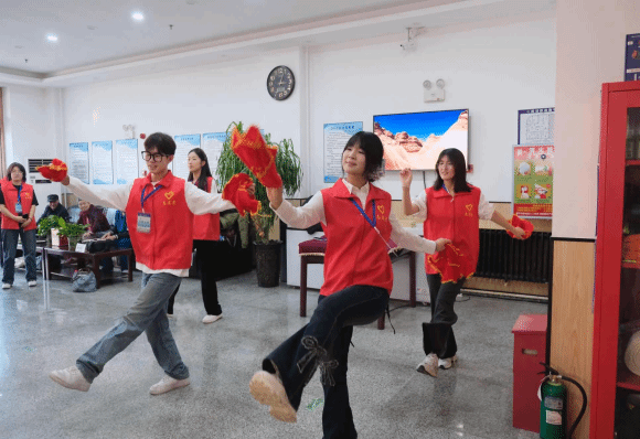 文艺展演环节将活动氛围推向高潮。《桃花朵朵开》《扭秧歌》等舞蹈活力十足,《蝴蝶泉边》《栀子花开》等歌曲悠扬动人,志愿者们的精彩演绎让老人们连连喝彩,脸上洋溢着幸福的笑容。台上台下温情交融、暖意流淌。这场兼具温度与情怀的视听盛宴,既让长者在熟悉的艺术记忆中撷取喜乐,更以青春之声唤醒岁月共鸣,让代际情谊在歌声与欢笑中深深缔结。