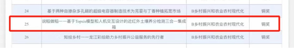 2022级地理科学行知班姜佳骐等撰写的项目《说稻做稻一一基于Topsis模型和人机交互设计的近红外土壤养分检测三合一集成箱》获得省级铜奖。