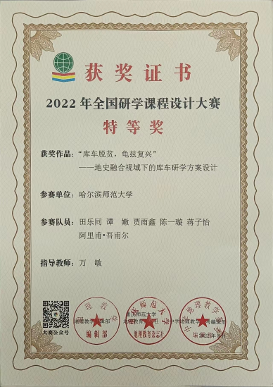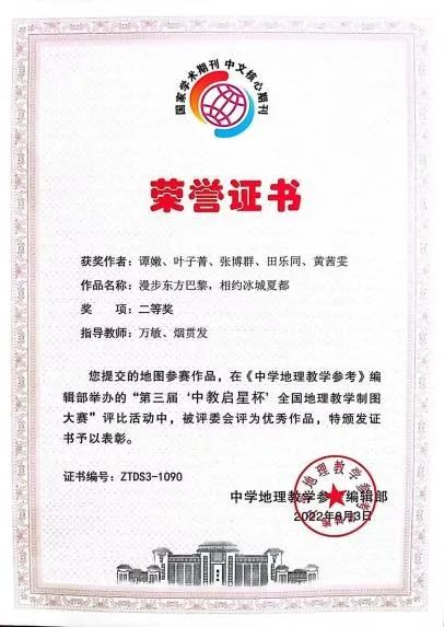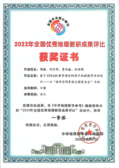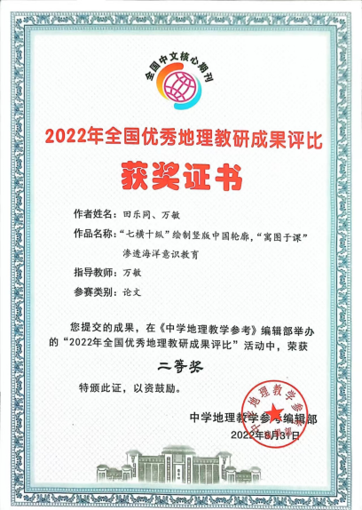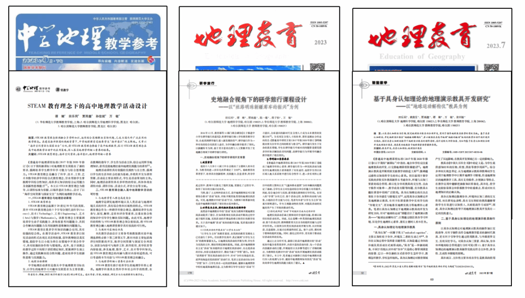 大二学年,他明确了要成为一名地理学科教育者的目标,进而将科研方向聚焦到地理教育教学领域。中国地理学会举办的研学旅行设计大赛是他参加的第一个地理教学研究竞赛,因此这次备赛的过程如摸石头过河一般,一切都是新的,一切都需要学习。很多天,他都伴着午夜的星空和黎明前的晨昏蒙影进行文献学习。最终,他带领团队获得国家级三等奖,但他心里却感觉很复杂,一方面是获奖的开心,另一方面是觉得还要更好。于是他开始了大量的地理教学研究,组织团队,参加了“九州杯”研学课程设计大赛,经过了为期三个月的备赛,其作品获得了国家级特等奖。在2022年的暑假,田乐同连续参加了“中教启星杯”全国地理教学制图大赛、“国优秀地理教研成果评比”等竞赛,连续撰写3篇一作论文,均获“国优秀地理教研成果评比”(论文类)二等奖。面向STEAM教育理念下的地理教学,他作为第二作者撰写了《STEAM教育理念下的高中地理教学活动设计》一文,并发表于北大核心期刊《中学地理教学参考》;面向地理研学旅行,他作为第一作者撰写了《史地融合视角下的研学旅行课程设计——以‘丝路明珠新疆库车的振兴’为例》一文,并发表于《地理教育》期刊;面向具身认知理论下的地理教具,他作为第一作者撰写了《基于具身认知理论的地理演示教具开发研究——以‘地球运动解构仪’教具为例》一文,并发表于《地理教育》期刊。田乐同常把自己的科研比作耕耘,他说:“我要把种出的果实送给我未来的学生们,让他们爱上地理,让学习地理成为一种快乐”。
