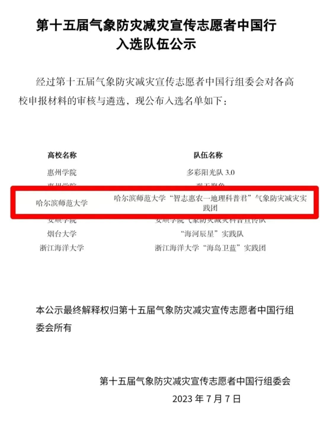 为深入贯彻党的二十大精神,增强新时代大学生的使命担当,地理科学学院积极响应校团委号召,组织学生参加大学生志愿者暑期“三下乡”社会实践。“智志惠农—地理科普君"气象防灾减灾实践团入选“气象防灾减灾宣传志愿者中国行”专项活动。