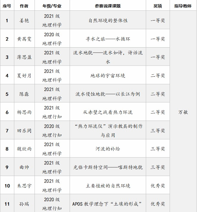 良好成绩的取得,充分展现了地理科学学院和教师教育学院的育人成效。我院将继续紧紧围绕学科核心素养和人才培养目标,引导学生夯实扎实的专业知识,培养娴熟的说课技能,提升良好的职业素养。