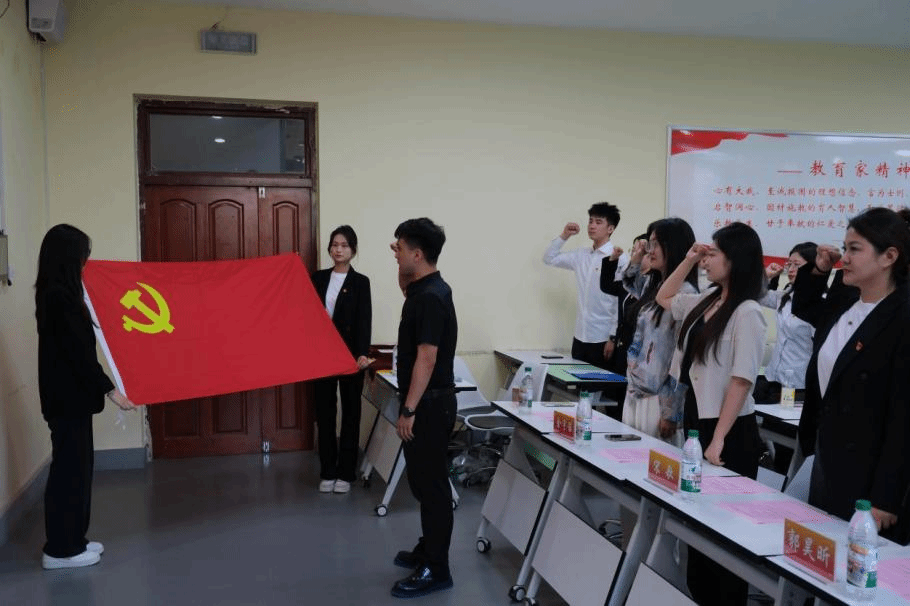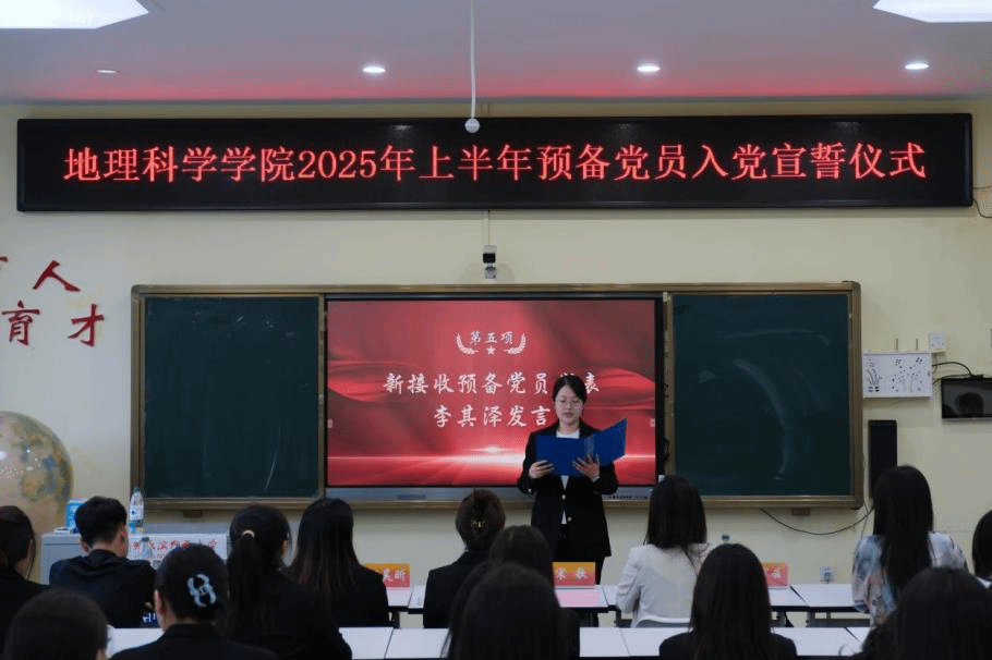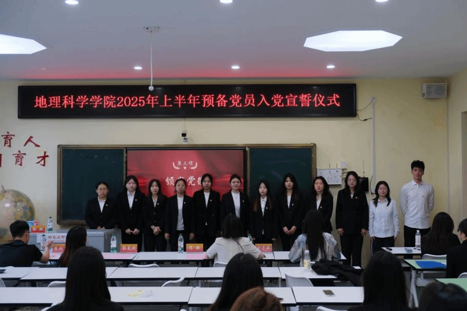 为进一步教育引导新发展党员铭记入党初心、强化党员意识、坚定理想信念,充分发挥先锋模范作用,在铿锵誓言中感受党员身份的神圣使命,增强对党组织的荣誉感与归属感。地理科学学院党委于6月20日18:00在理工三215室举行2025年上半年预备党员入党宣誓仪式,学院党委委员宋歌、学院党委委员郭昊昕、全体辅导员及2025年上半年预备党员参加仪式。本次活动由本科生第四党支部书记彭琳主持。