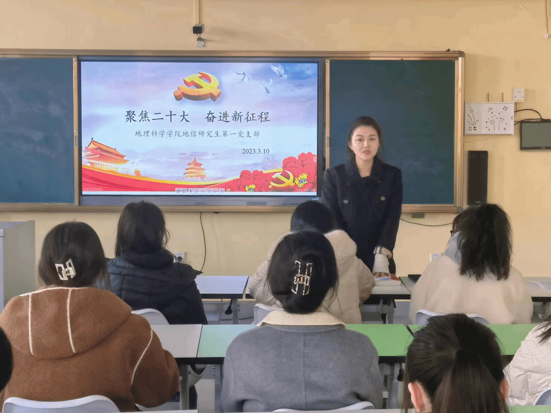 为深入学习宣传贯彻党的二十大精神,引导支部党员切实将思想和行动统一到党的二十大精神来,凝聚奋进新征程的精神力量,地理科学学院地信研究生第一党支部2023年3月14日14点在理工三215室组织开展“聚焦二十大,奋进新征程”集中理论学习,支部书记、学院学工办主任宋歌老师带领全体党员从“学”、“思”、“行”三个维度,全面深入领会党的二十大精神。