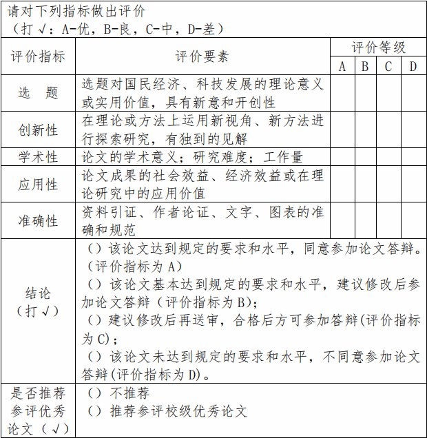 4.该论文未达到规定的要求和水平,不同意参加论文答辩(评价指标为 D)。上述第一种、第二种为“通过”,第三种为“再次送审”,第四种为“不通过”。